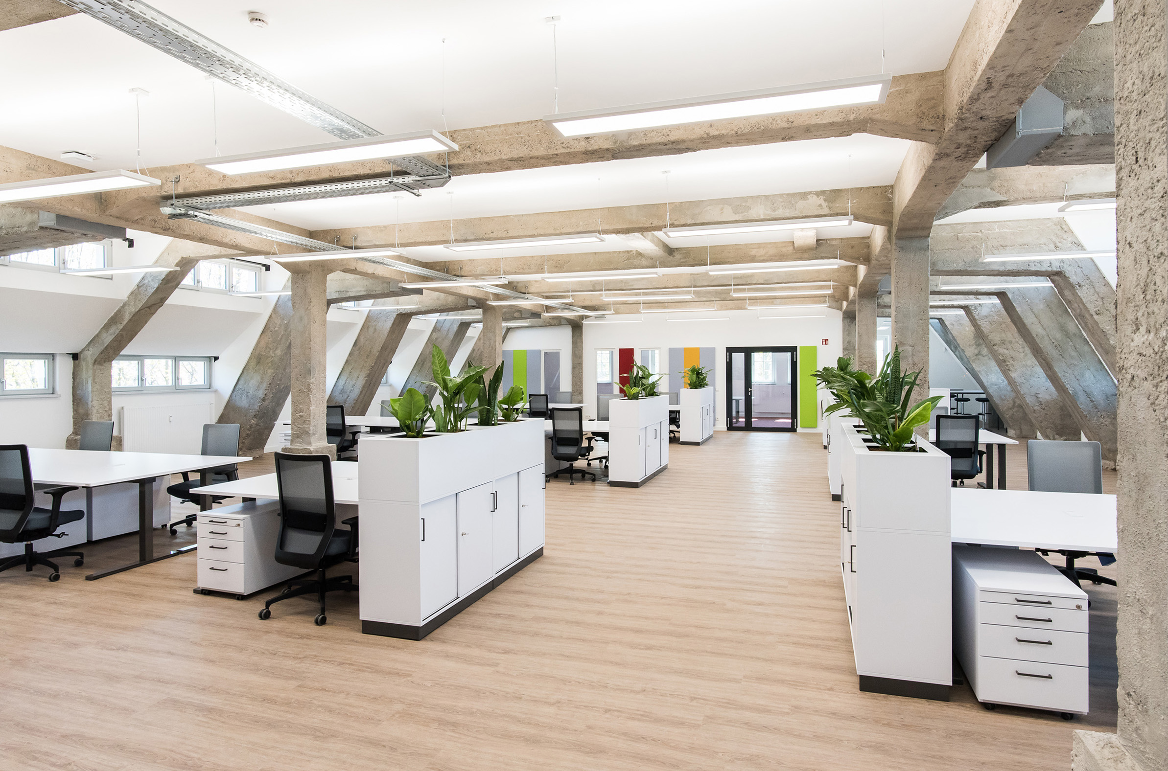 The understated office design with white furniture, few colour accents and green plants allows the historic building fabric to come into its own. The zoned workstations are equipped with Eco N2 and Avaro Q motorised desks and mobile pedestals from REISS. The corridor is separated by sliding door cabinets with plant stands. Adjacent to the open-plan office is a large meeting room with a REISS Eco N2 meeting table with four double columns. The individual offices offer plenty of storage space for important documents with REISS cabinets and shelves. A project in which architecture and furnishings form a perfect symbiosis. (Photos: Annett Goralski)