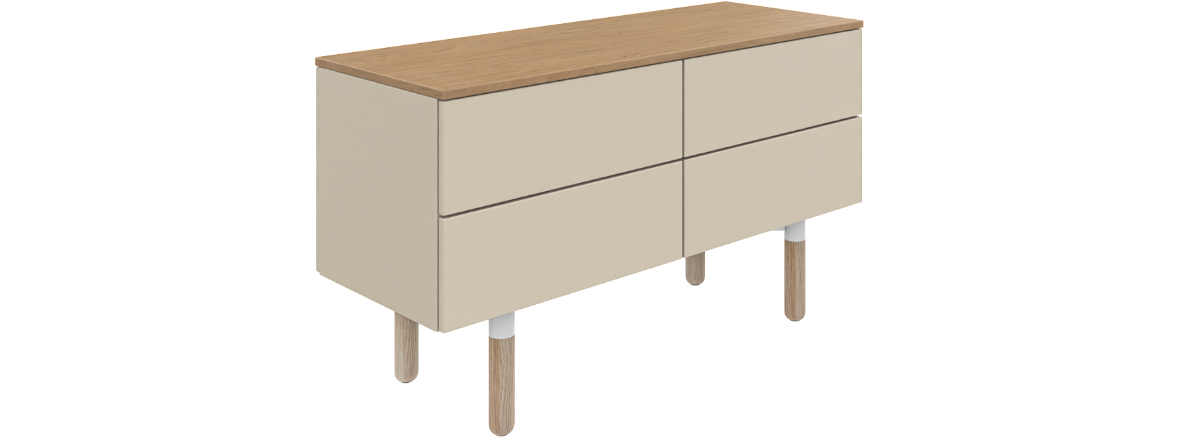 A special highlight is the top panel: available with either a melamine panel or a glass laminate finish, the lowboard becomes an expressive design object with a high-quality feel. Three different base options – a delicate Q20 base frame, a straight sheet metal base or a cosy wooden base – open up additional design possibilities.
