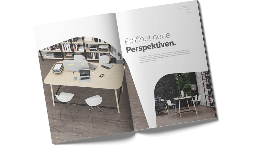 The idea: to express design not only in form and materials, but also in new functional features. Thus, after several iteration stages, the basic design emerged that characterises REISS Trailo® today – the REISS rail® as the centrepiece in combination with curved tabletop shapes, various leg versions and tabletop heights, as well as a diverse, homely mix of materials.