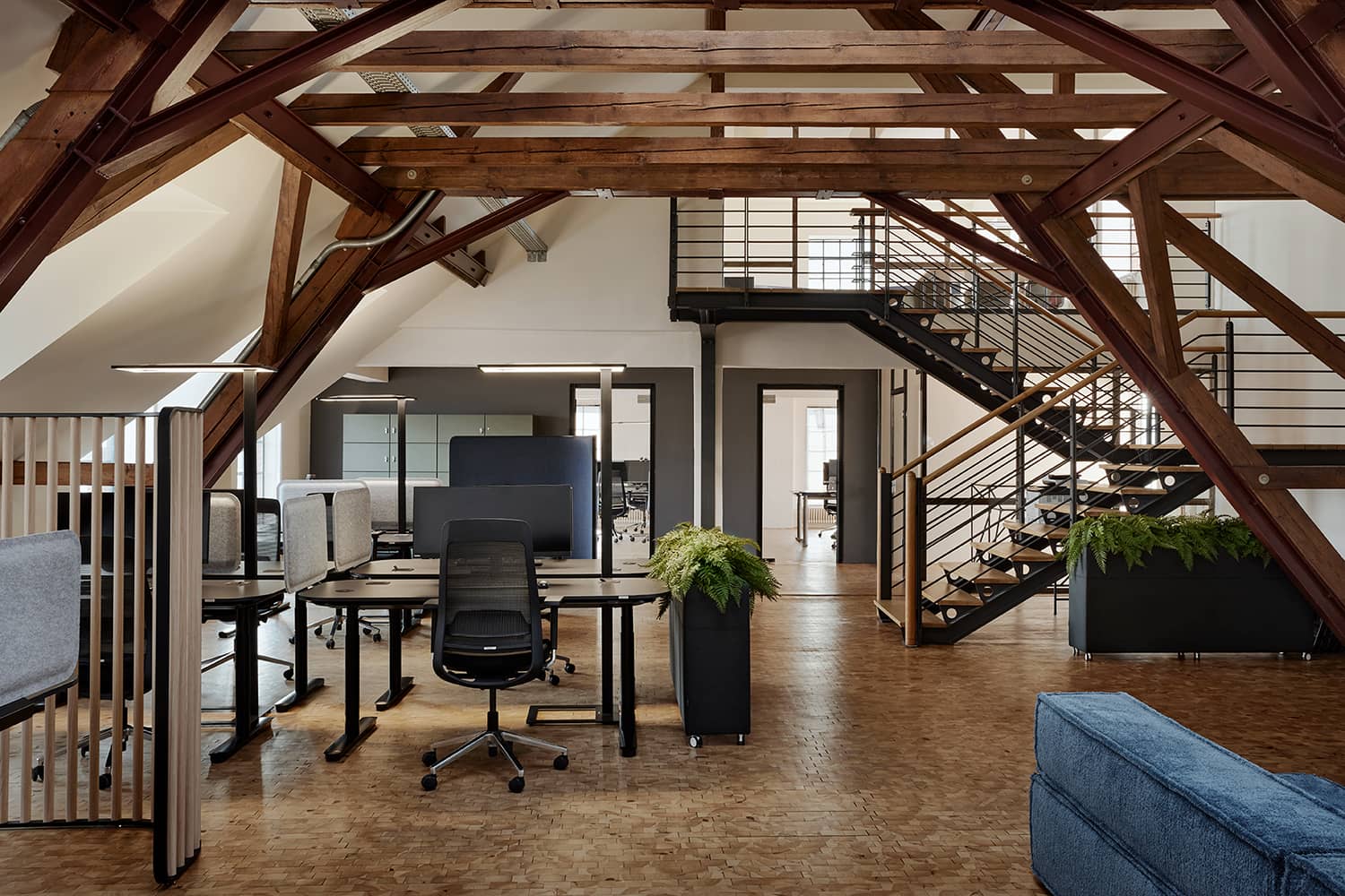 La “Alte Pianoforte-Fabrik”, construite en 1873, est située de manière pittoresque dans une cour intérieure du quartier Schanzen de Hambourg. L’ancien bâtiment de l’usine a été entièrement rénové à la fin des années 1990 et transformé en une cour commerciale avec des bureaux-lofts contemporains. Les locaux de MPA Pharma GmbH se trouvent au dernier étage et ont été équipés de tables design de la série REISS Trailo® en anthracite/noir, ce qui crée un contraste moderne avec les éléments en bois de la pièce. Les armoires à casiers REISS et les tables d’appoint REISS Trailo® One en vert complètent harmonieusement le concept de couleurs. (Photos : Nina Struve)