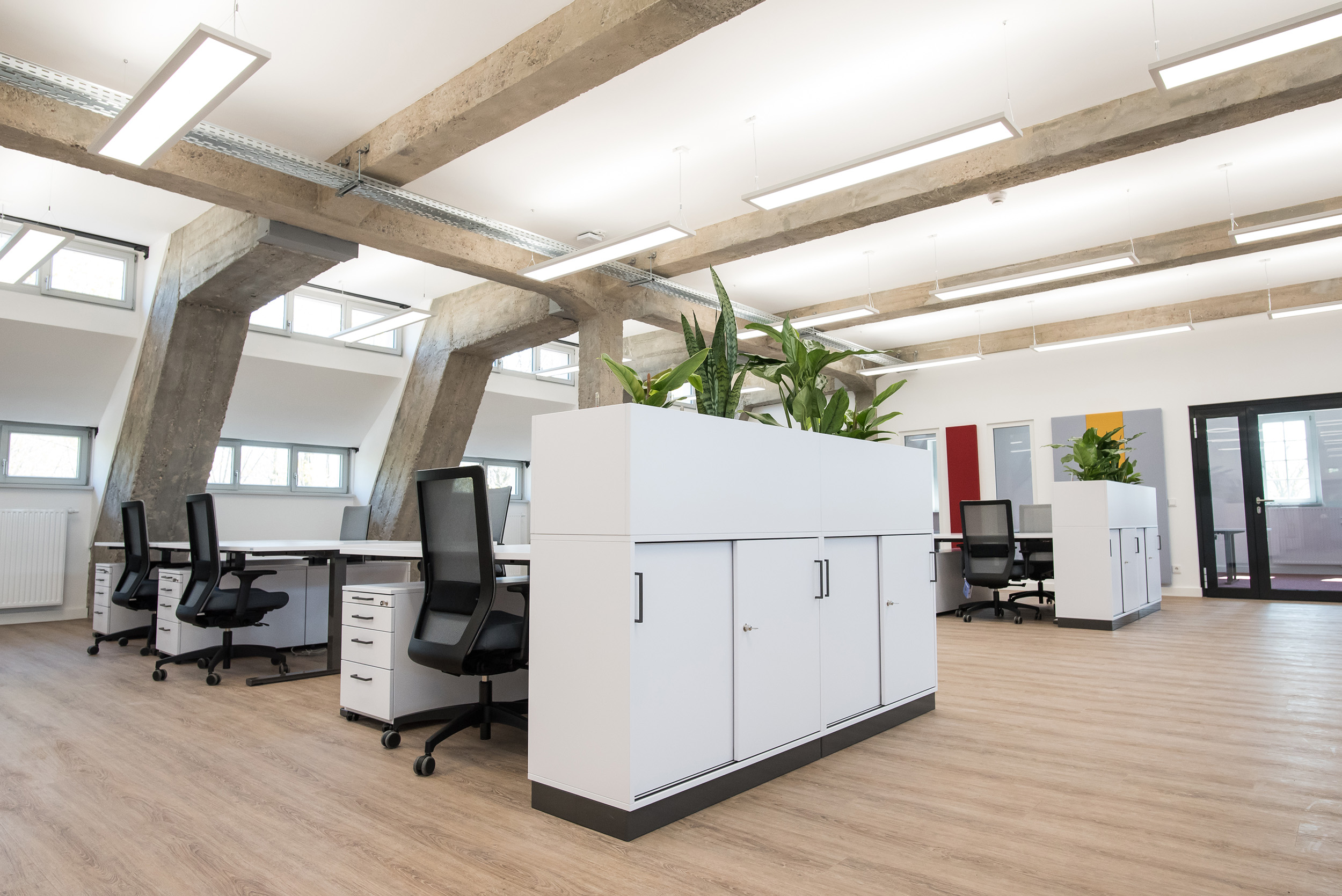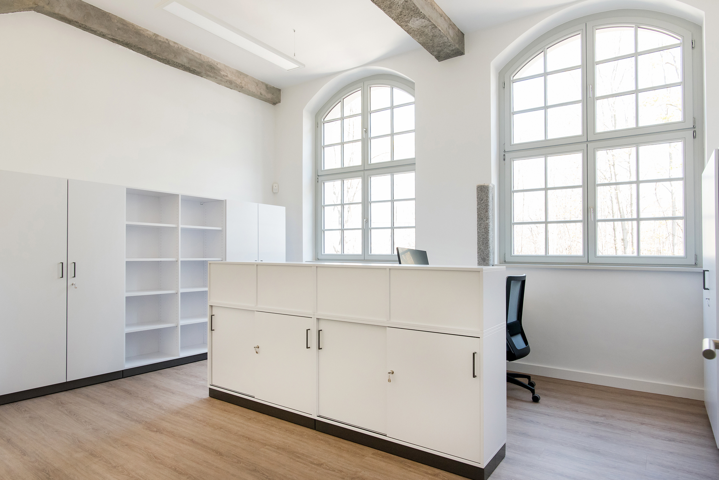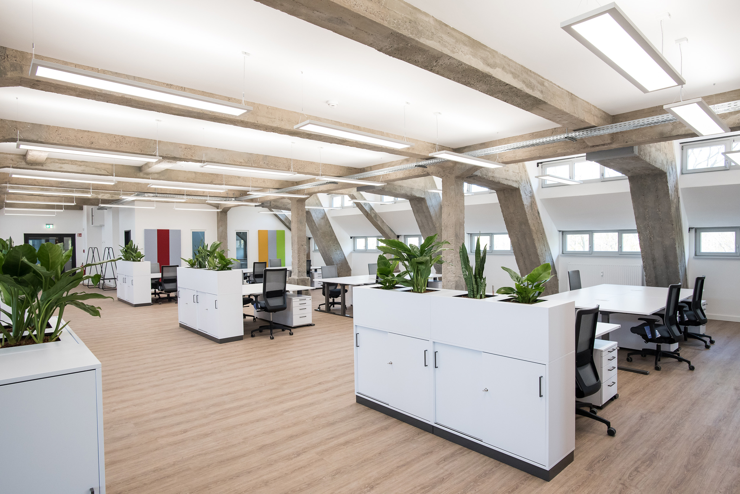 Le design sobre des bureaux, avec des meubles blancs, quelques touches de couleur et des plantes vertes, met en valeur le caractère historique du bâtiment. Les postes de travail, répartis en zones, sont équipés de tables Eco N2 et Avaro Q Motortischen et de caissons à roulettes de REISS. Les espaces sont délimités par des armoires à portes coulissantes avec des jardinières. Au départ du bureau open space se trouve une grande salle de réunion avec une table de réunion REISS Eco N2 à quatre doubles colonnes. Les bureaux individuels offrent beaucoup d'espace de rangement pour les documents importants grâce aux armoires et étagères REISS. Un projet où l'architecture et le mobilier forment une symbiose parfaite. (Photos : Annett Goralski)