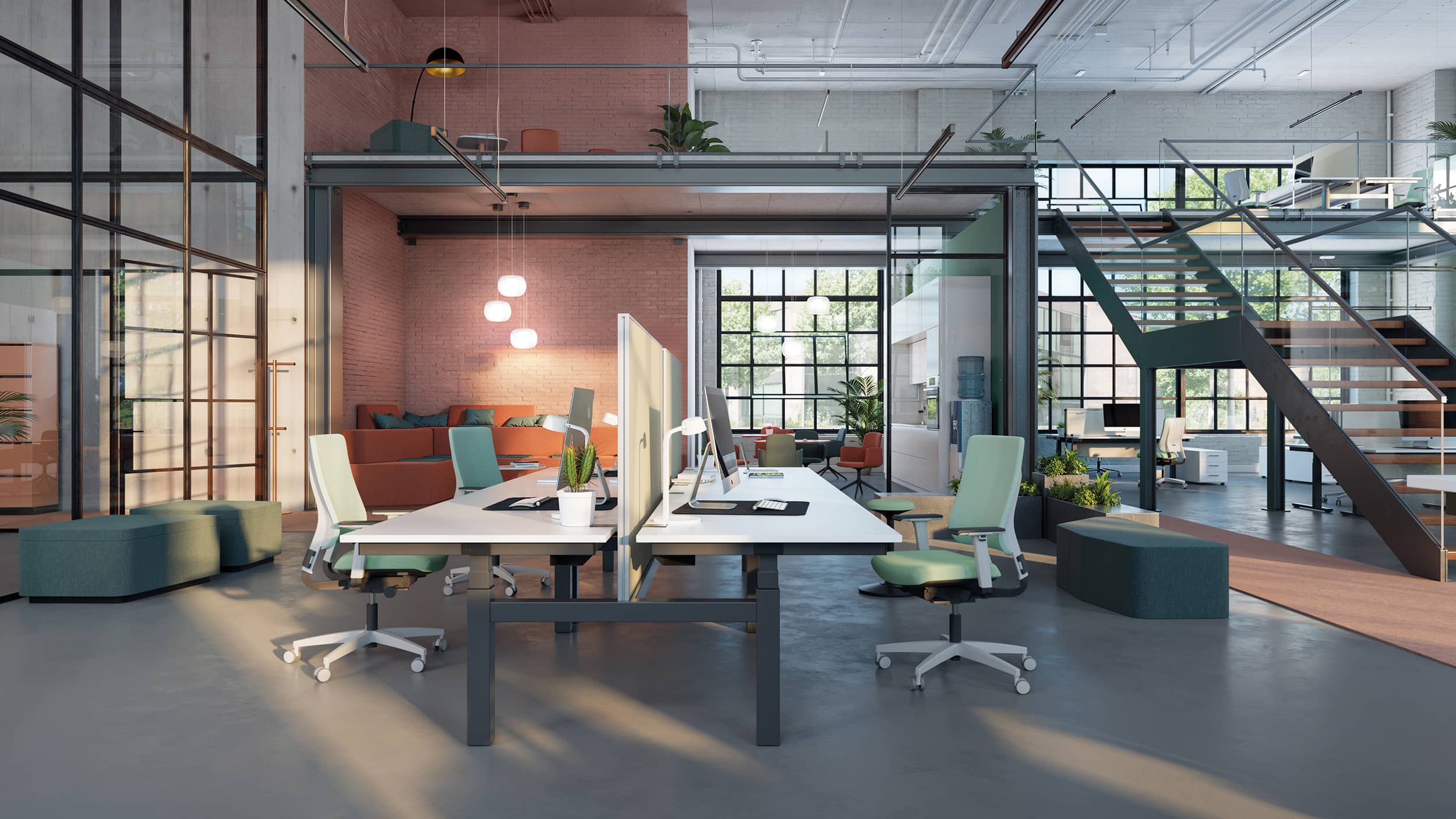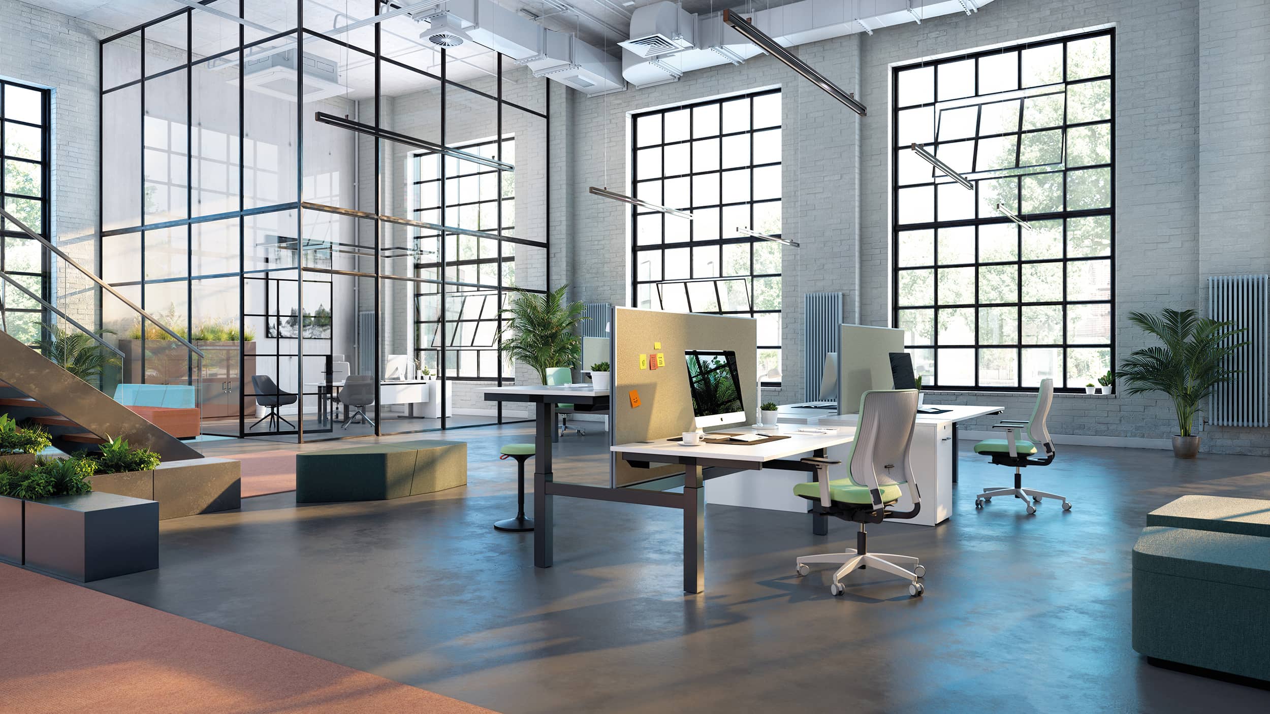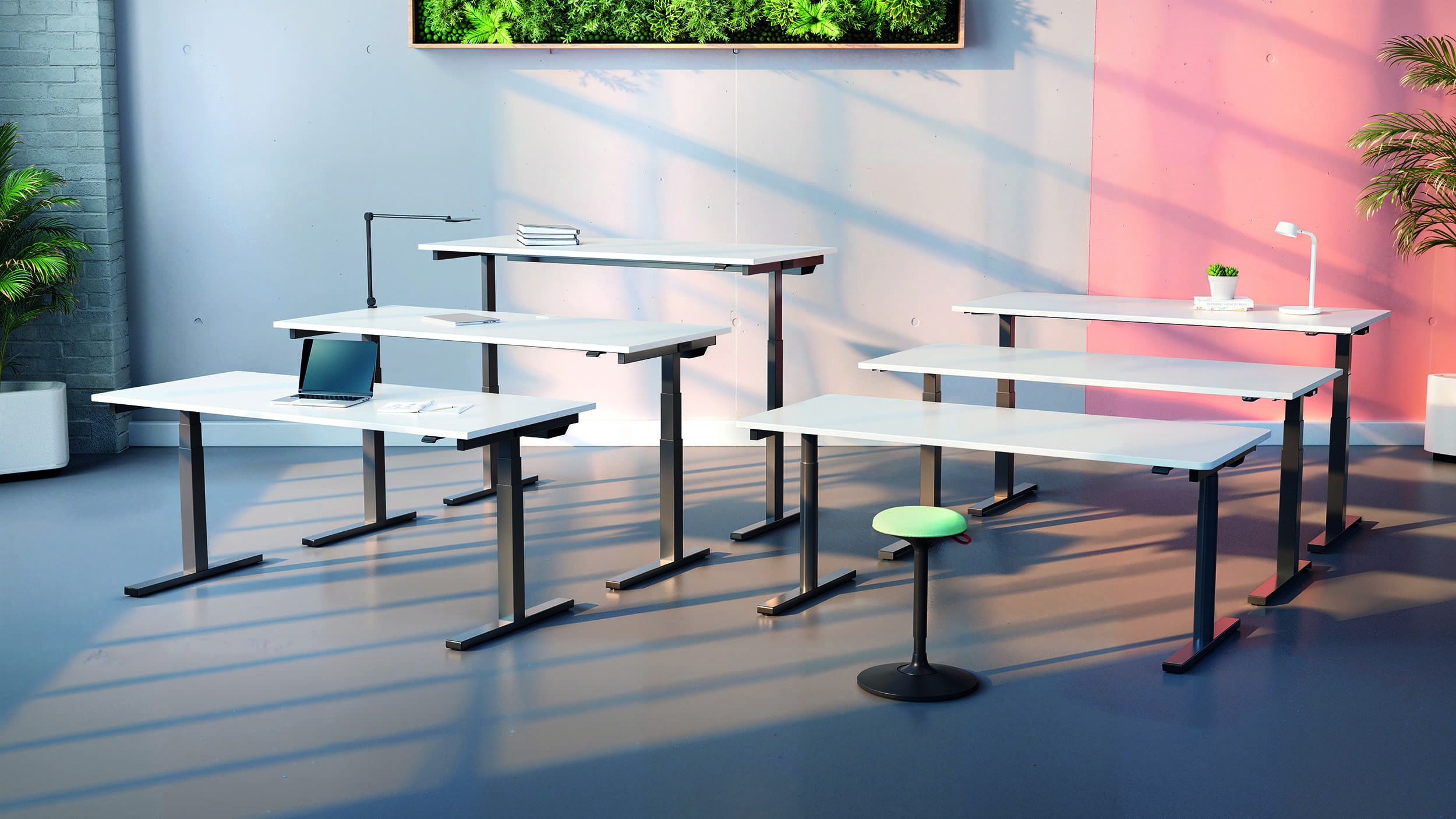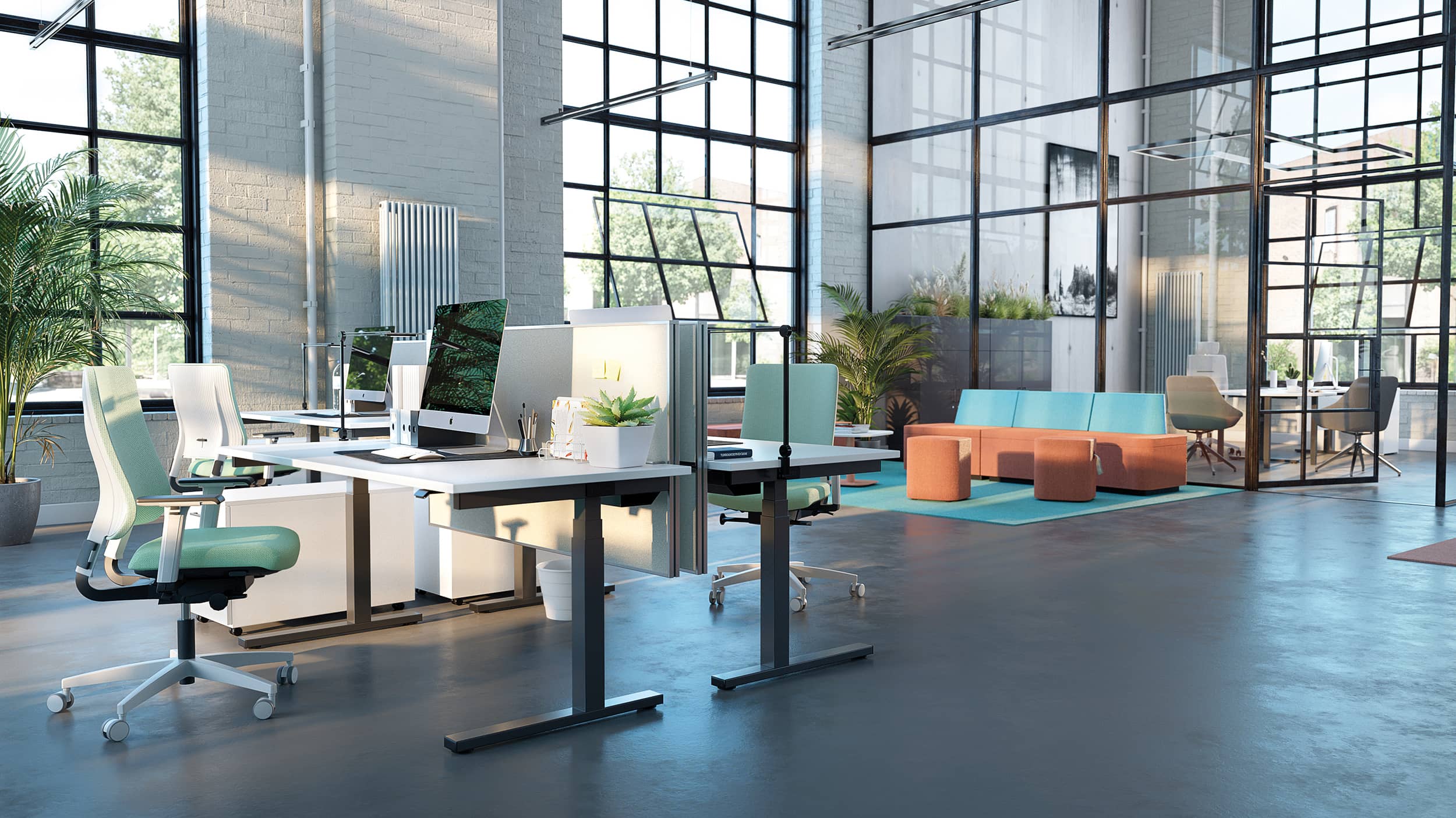 Höheneinstellbare Bench-Lösung für Teamarbeitsplätze.