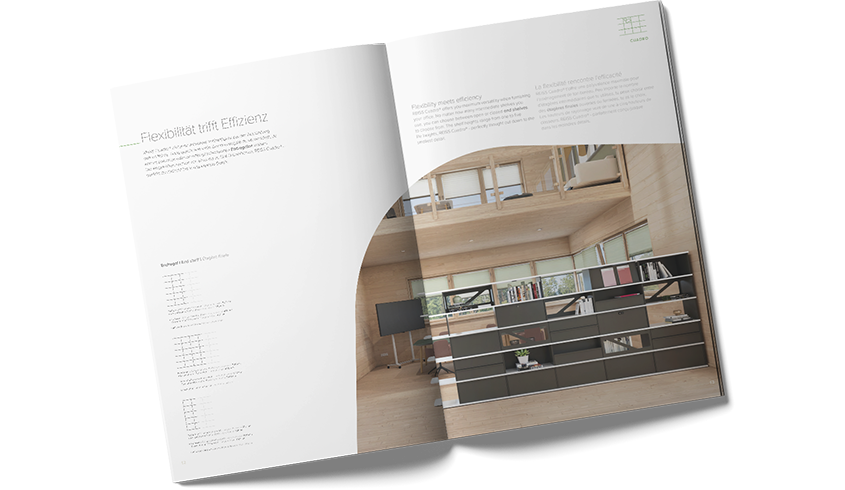 Ob als Sideboard, Raumregal im Einzelbüro oder als raumfüllendes Multizonen-Konzept: REISS Cuadro® passt sich perfekt an die Bedürfnisse des modernen Arbeitsalltags an. Die Kombination aus geschlossenen Flächen und offenen Regalen sowie Präsentationsflächen schafft eine funktionale Vielseitigkeit für eine inspirierende und zugleich effiziente Arbeitsumgebung. Eine große Auswahl an modernen Farben und Dekoren verleiht jedem Arbeitsbereich einen individuellen Charakter. REISS Cuadro® wächst mit den sich ständig ändernden Anforderungen in der Arbeitswelt. Dank des praktischen Clicksystems lassen sich die Regalelemente schnell und einfach horizontal sowie vertikal erweitern.
