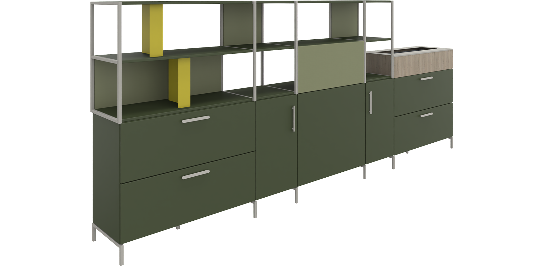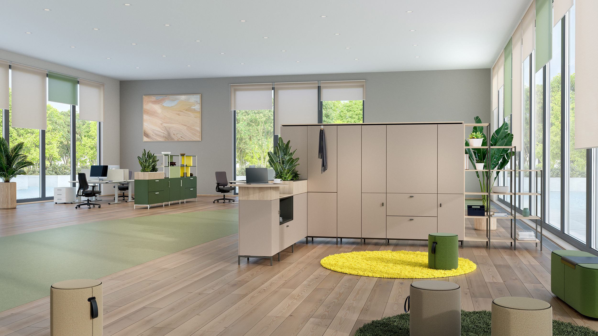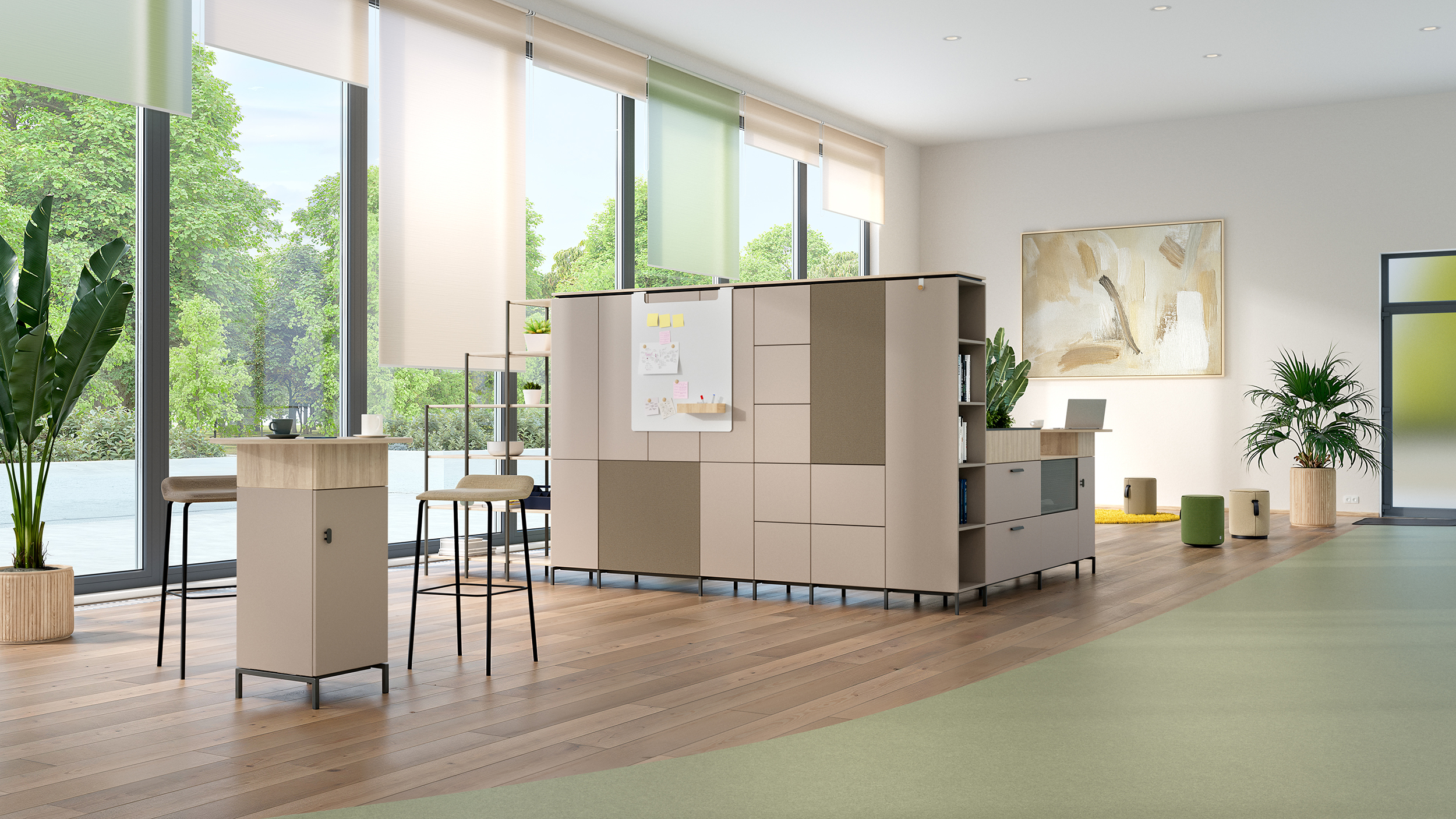 Die REISS Subero® Mittelzone bietet flexible Möglichkeiten zur Raumgliederung und Organisation – sowohl freistehend im Raum als auch Wand nah platziert. Dank der um 180° drehbaren Elemente ist eine beidseitige Nutzung problemlos möglich, was die Funktionalität und Effizienz in offenen Bürolandschaften deutlich erhöht. Alle Module sind mit der kompletten Dekor- und Farbauswahl konfigurierbar – für ein harmonisches Design, das sich perfekt in jede Arbeitsumgebung einfügt. Optional erhältliche Pflanzaufsätze bringen Natur ins Büro. Sie bestehen aus einem hochwertigen Kunststoffeinsatz sowie einer robusten Abdeckplatte aus Stahlblech. Das Eckmodul mit Regalfunktion erlaubt eine 90°-Konfiguration der Mittelzone. Die wählbare Anschlagseite definiert die Richtung der Ecklösung und sorgt für maximale Planungsfreiheit. Der Meetingpoint kombiniert einen 2 OH-Elektrifizierungskorpus mit einem kreisförmigen Aufsatz. Optional kann er mit einem ausziehbaren E-Modul ausgestattet werden – ideal für spontane Besprechungen und kurze Abstimmungen direkt am Arbeitsplatz.