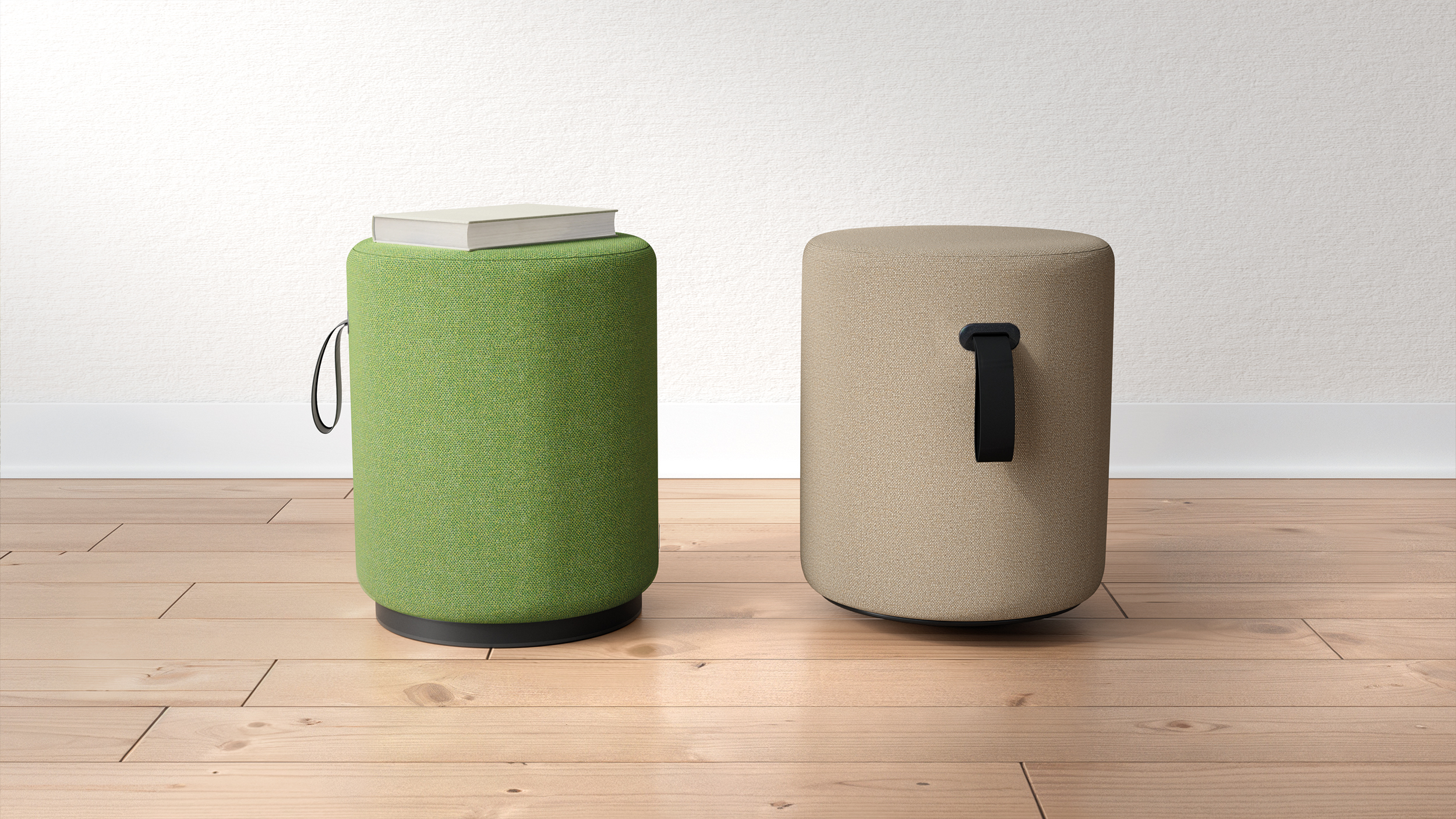 Die ovale Bank ist wie auch die Sitzinsel entweder mit Plastikgleitern oder Holzfüßen in lackierter Eiche verfügbar und kann wahlweise mit einer schwarzen Metallablageplatte versehen werden, die seitlich verschiebbar ist. Aufgrund ihrer Form kann die Bank entweder flexibel von zwei Personen nebeneinander oder einer Person in verschiedenen Sitzpositionen genutzt werden.